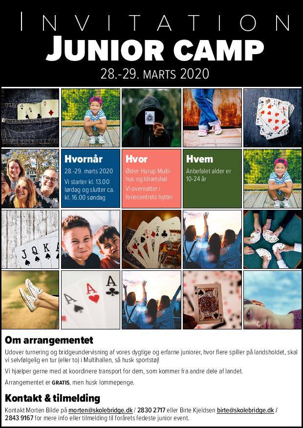 When? 28-29 March 2020 We start at 1.13pm on Saturday and end approx. pm. 16.00 Sunday 111V erster Hurup Mult. house and Sports Hat. We spend the night in iL_iecent’s court hut Who? About the event In addition to the tournament and bridge lessons of our talented and experienced juniors, where several players play on the national team, we of course need a trip (or two) in the Multihallen, so remember sports clothes. We would like to help coordinate transport for those coming from other parts of the country. The event is FREE, but keep in mind pocket money. Contact & Registration Contact Morten@skolebridge.dk / 2830 2717 or birte@skolebridge. dk 2843 9167 for more info or to register for the spring feds. junior event.Don’t forget to follow us @