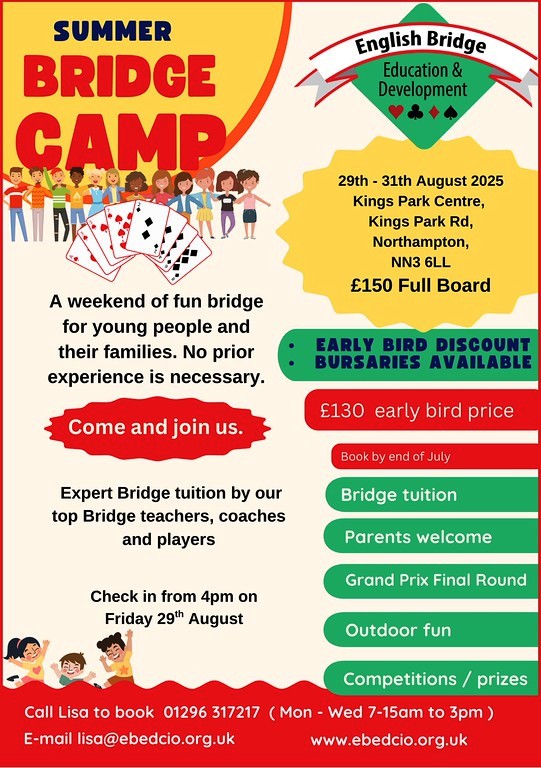 The EBED Summer Youth Bridge Camp 2025 will take place from Friday 29th to Sunday 31st August at the King’s Park Conference Centre in Northampton.