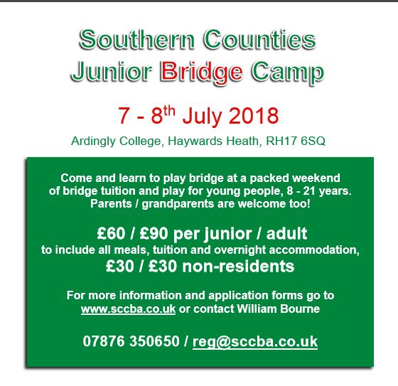 Sussex CCBA will be holding another residential Junior Bridge Camp on Saturday 7th and Sunday 8th July 2018. The event includes lessons, competitions, and other fun activities, and is open to all young players – from beginners to experts, and from 8 to 21 years old. It will take place at Ardingly College near Haywards Heath.