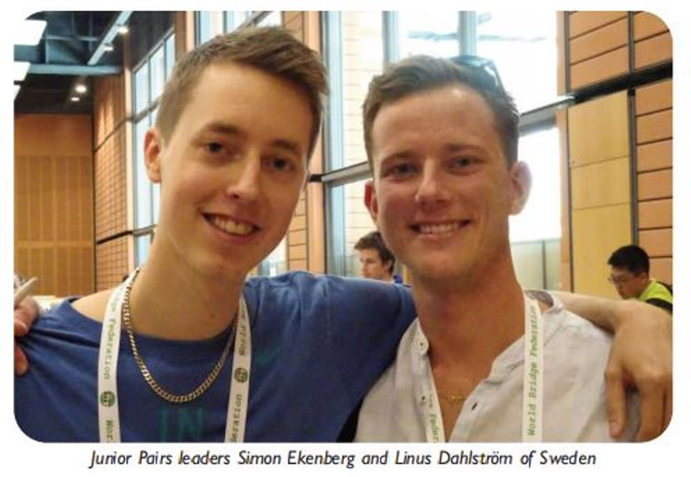 The leaders of the Junior Pairs – Simon Ekenberg and Linus Dahlström of Sweden – will start play today with a carryover of 36 matchpoints. The other 13 pairs in the A final of the event will have matchpoint totals descending to zero for the pair in the final qualifying spot.
